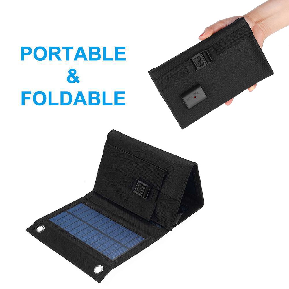 Foldable 20W solar panel with USB and DC output options, lightweight.