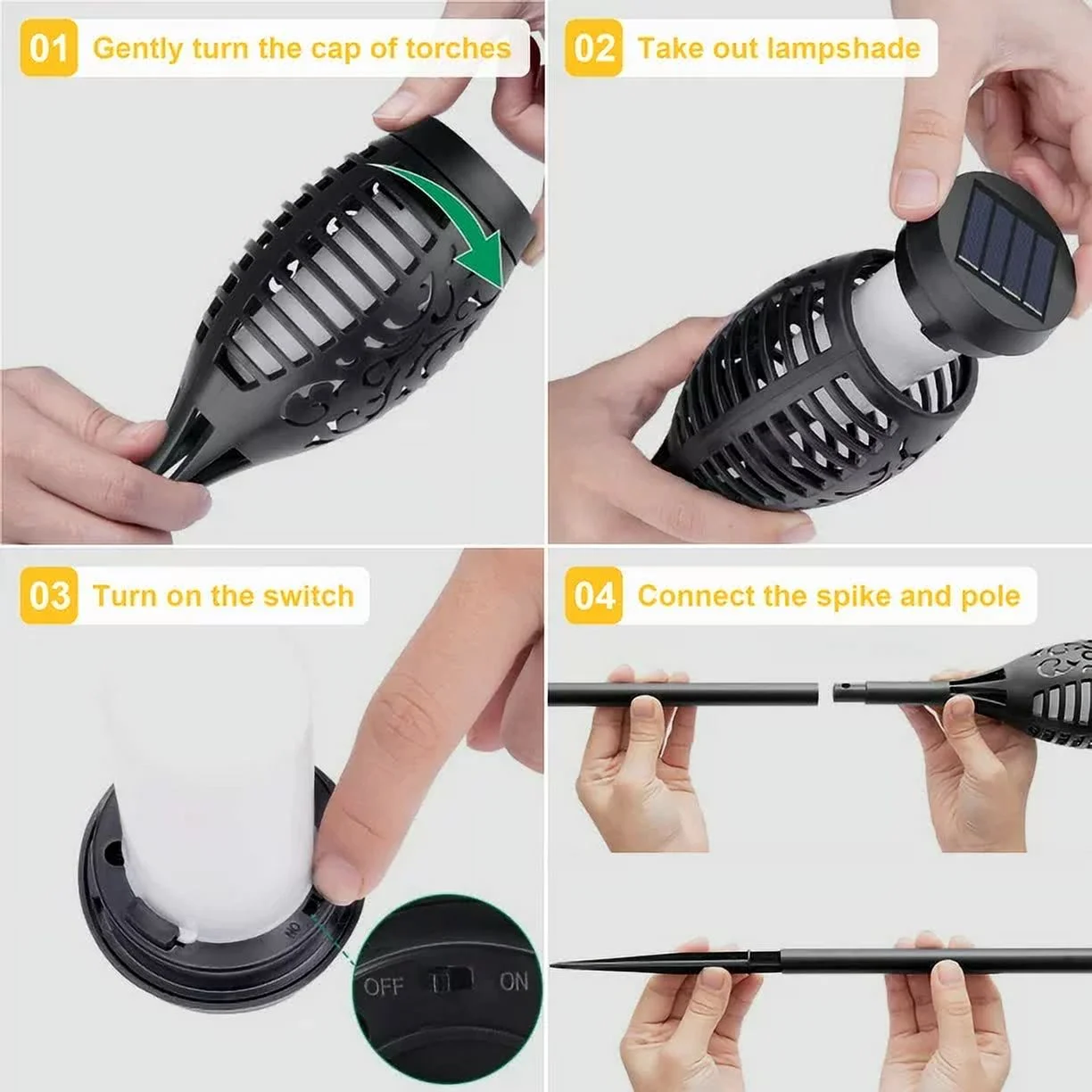 The flickering outdoor lights are made of high quality and durable IP65 Waterproof ABS material, thus withstanding all kinds of weather, allowing you to enjoy the dancing flames all around the year. That is why our solar powered torch lights are perfect for outdoor use, acting as a beautiful decoration lighting for your garden, pathway, driveway, backyard, etc.